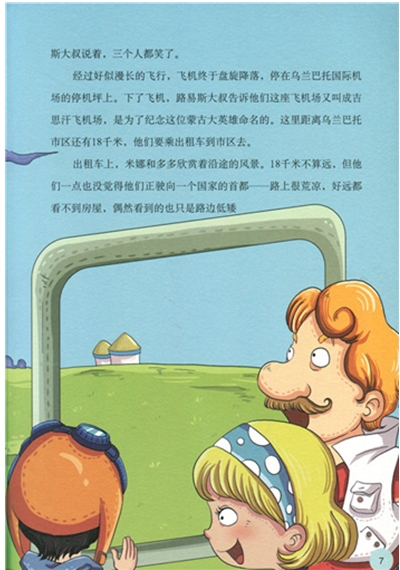 经过好似漫长的飞行,飞机终于盘旋降落,停在乌兰巴托国际机场的停机坪上。下了飞机,路易斯大叔告诉他们这座飞机场又叫成吉思汗飞机场,是为了纪念这位蒙古大英雄命名的。这里距离乌兰巴托市区还有18千米,他们要乘出租车到市区去。