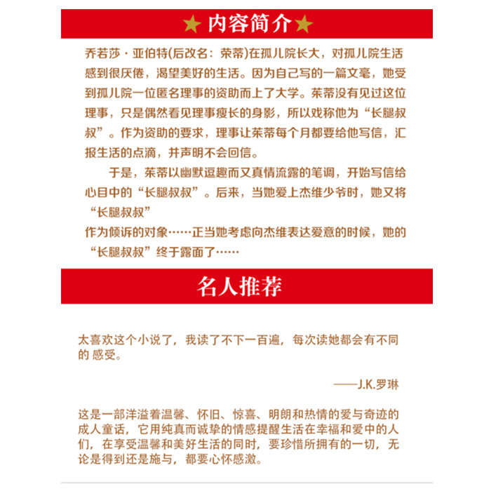 《长腿叔叔》被誉为温馨、浪漫、诙谐有趣的成人童话经典之作!这是一部洋溢着温馨、怀旧、惊喜、明朗和热情的爱与奇迹的成人童话,它用纯真而诚挚的情感提醒生活在幸福和爱中的人们,在享受温馨和美好生活的同时,耍珍惜所拥有的一切,无论是得到还是施与,都要心怀感激。