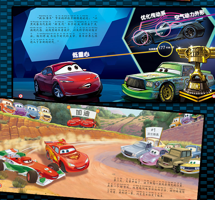 这是一本图画故事,主题为赛车总动员。包含2场赛车总动员故事中的重要赛事:《霓虹大赛》和《接力对抗赛》。每本60页。在精彩的故事之外,还有与大赛相关的认知知识编加页,让喜欢赛车的小读者拓展更多的赛车小知识。