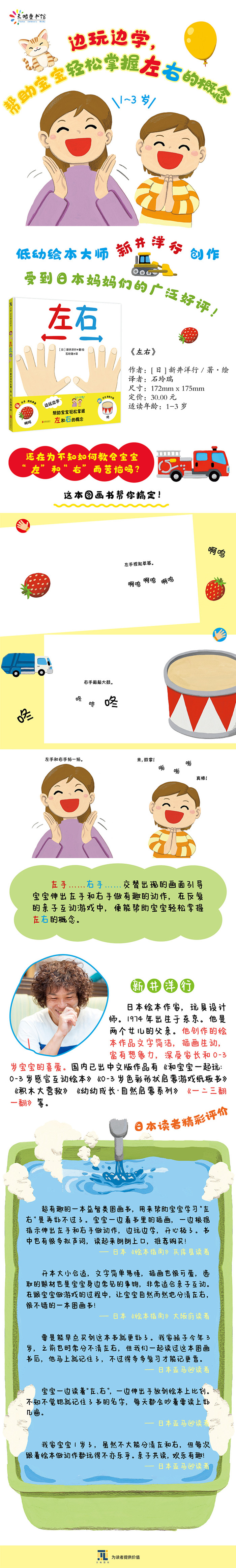 伸出你的左手和右手,分别放在书的左右页面上。 左手捏起草莓,啊呜啊呜。右手敲敲大鼓,咚咚咚。 左手……右手……交替出现的画面引导宝宝伸出左手和右手做有趣的动作,在反复的亲子互动游戏中,便能帮助宝宝轻松掌握“左”和“右”的概念。 边玩边学,帮助宝宝轻松掌握“左右”的概念。超级适合宝宝的一本图画书!