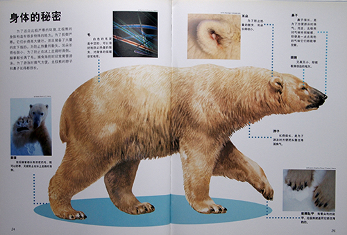 这套全球同步上市的珍藏版动物百科图鉴,汇集了世界顶级插画家的绘画杰作和著名野生动物摄影师的珍贵镜头,以及世界权威动物学家精准和优美的文字。为全球动物爱好者和少年儿童读者,再现了栩栩如生、全景式的动物世界!这大型的动物图鉴丛书,既是动物生活和生态的百科全书,也是世界顶级插画家约翰·弗朗西斯传世作品的典藏之选!本书为其中一册,介绍了北极熊。北极熊生活在北极圈内,主要以海豹为食。为了适应北极严寒的环境,它们的身体结构很特殊。雌性北极熊怀孕之后,将在越冬的洞穴中生下幼崽。幼崽要先跟母亲生活两年,然后慢慢独立生活。