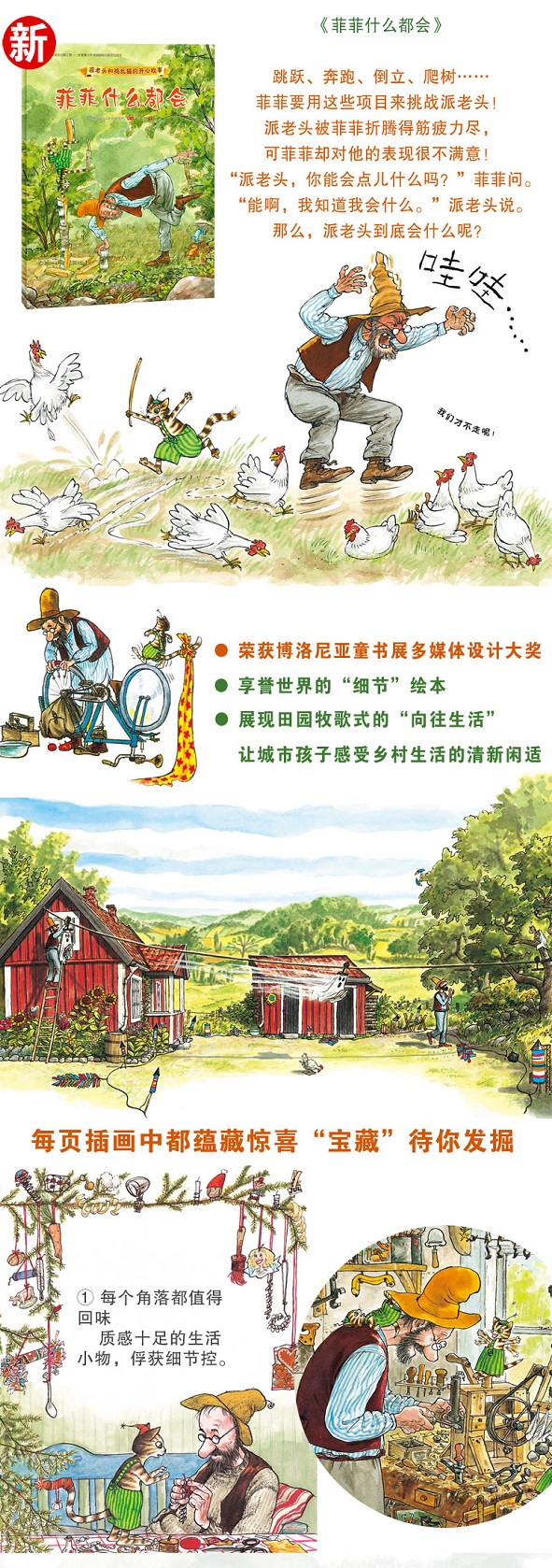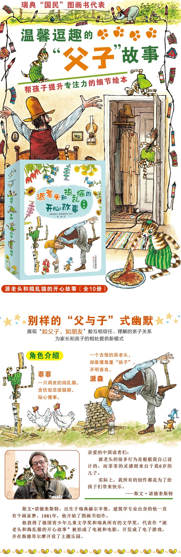 “派老头和捣乱猫的开心故事”系列已经成为瑞典绘本的象征,书中每一页的插画都以“细节”取胜,荣获了博洛尼亚童书展多媒体设计大奖。作者斯文诺德奎斯特还获得了德国青少年儿童文学奖和瑞典所有的文学奖。