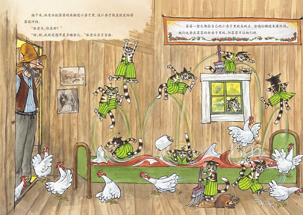 斯文·诺德奎斯特的图画书就像一个永远挖掘不尽的宝藏。在每一个细处,每一个角落,都有小动物在向你讲述他们有趣的故事。对于中国的读者来说,小猫菲菲和派老头的关系耐人寻味:菲菲不是一只听话的好猫,但他的幽默、调皮表现出孩子特有的活泼和聪颖;派老头看上去有点儿怪怪的,可他对菲菲的爱和尊重让他就像是一位善解人意的开明父亲,而这样互相信任的父子关系恰恰是许多中国孩子所渴望的。