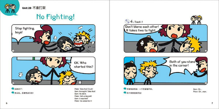 在《全班说英文》三本书中,共收录超过 150个情境对话。您可以从各册的目录中,快速地查询到自己想要了解的内容。每个单元的内容有:清楚明显的英文标题、标题中译、可爱逗趣的漫画及老师的对白,而孩子的对白则补充在漫画右下方,提供老师作为教学参考。另外,您还可在漫画左下方看到老师对白的中译,以及字词注释。而在漫画右页上方标示本单元在 CD中的节点位置