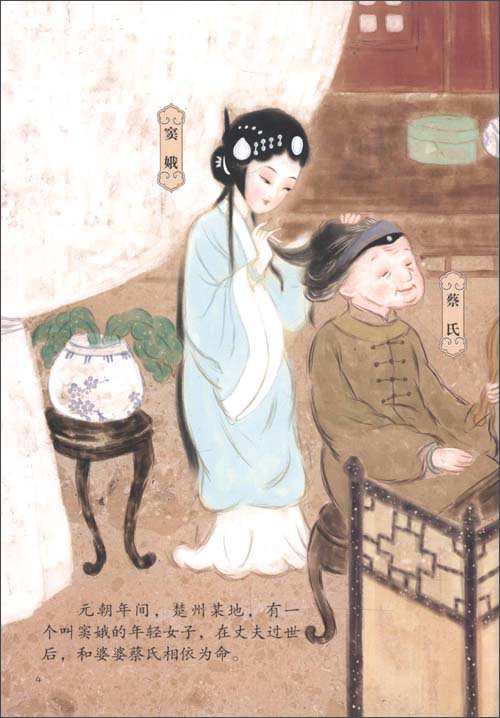 《窦娥冤》是这系列图画书首推的两册之一。图画书根据元曲代表作《感天动地窦娥冤》改编,这篇文章收录在中学语文课里本,作为流传甚广的一个故事,它是一曲人世的悲歌,更是对于窦娥的伟大赞歌。作者关汉卿位于元曲四大家之首,是元代杂剧的奠基人,被称为中国的“莎士比亚”。关汉卿在《窦娥冤》中以其瑰伟的想象力为故事增添了很多神奇的色彩。这点甚至有点像小孩子喜读的童话。窦娥临行前发愿说:“如果我是冤枉的,那么就让我的血溅白绫,一点一滴都不可以洒在地上;如果我是冤枉的,就让楚州六月大雪,三年大旱。直到我的冤情大白于天下。”窦娥死后,三桩誓愿一一都实现了,窦娥的冤情惊动了朝廷,终于重审此案,获得昭雪。