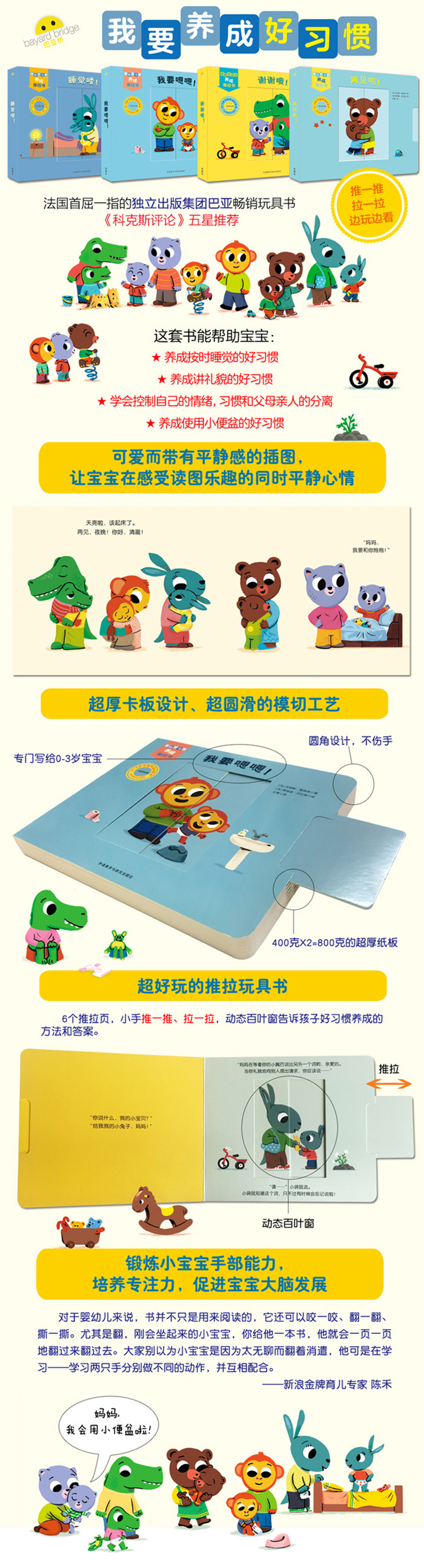 这套书能帮助宝宝:1.养成按时睡觉的好习惯;2.养成讲礼貌的好习惯;3.学会控制自己的情绪,习惯和父母亲人的分离4.养成使用小便盆的好习惯