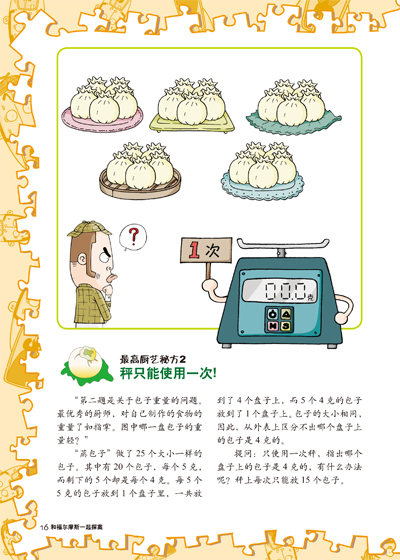中国厨师“不好吃”今天又被客人训了一顿。理由只有一个,就是因为他做的食物太难吃。有一天,他看到一个报道,说著名的包子厨师“蒸包子”要挑选弟子传授厨艺。不过,要想成为“蒸包子”厨师的弟子,就得回答他提出的所有问题。没有信心解题的“不好吃”将此事委托了侦探福尔摩斯。中国最高厨师“蒸包子”提出的谜题是什么?请各位与福尔摩斯一起解答问题,来帮助“不好吃”,怎么样?
