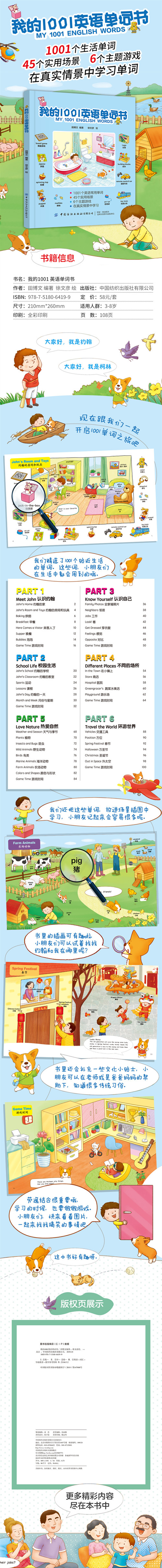 《我的1001英语单词书》是一套给学龄前儿童的英语单词书。画面丰富、色彩亮丽,内容简单。全书共分为6个主题: Meet John 认识约翰 School Life 校园生活 Know Yourself 自我认识 Different Places 不同的场所 Love Nature 热爱大自然 Travel the World 环游世界。所选词汇涵盖生活的方方面面,情景式图片对应所学单词,模拟在真实情境中学习语言。每个单元设置有主题游戏,训练词汇的同时,提高学习的趣味性,增加学习者的兴趣。版式设计多样,不枯燥乏味。是一本零基础学英语,兴趣培养入门书,使读者从语言、认知全面提高。