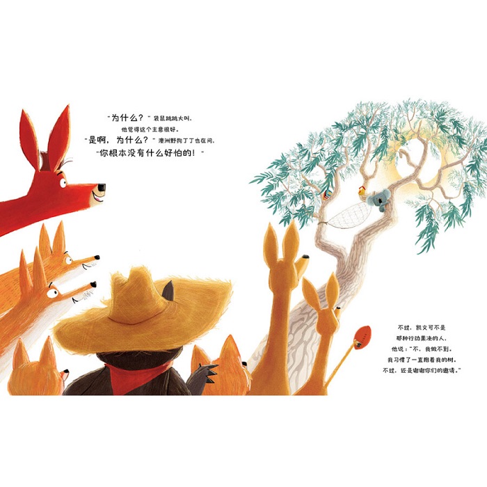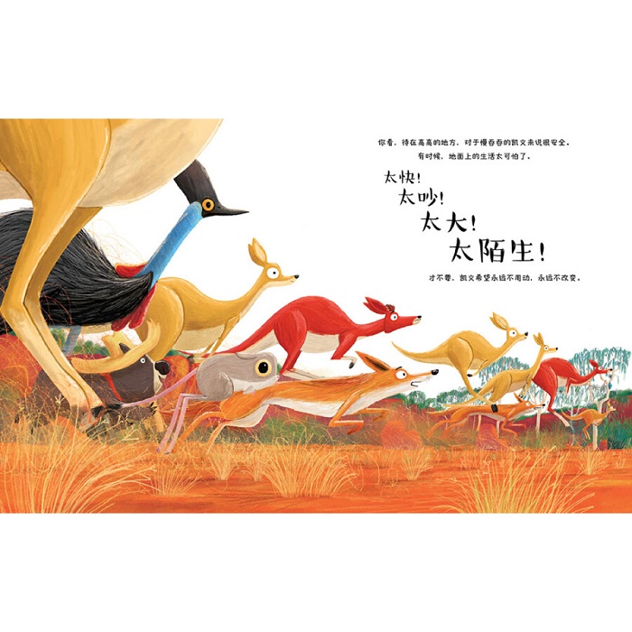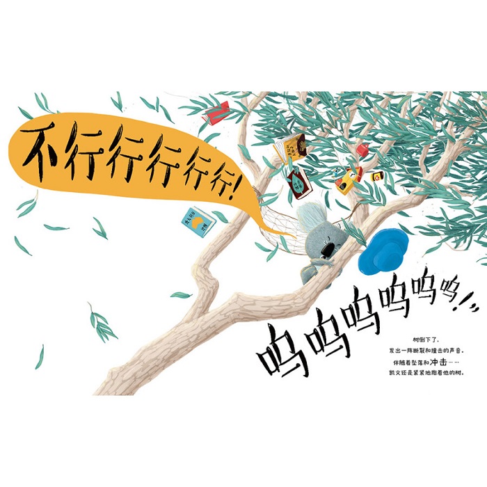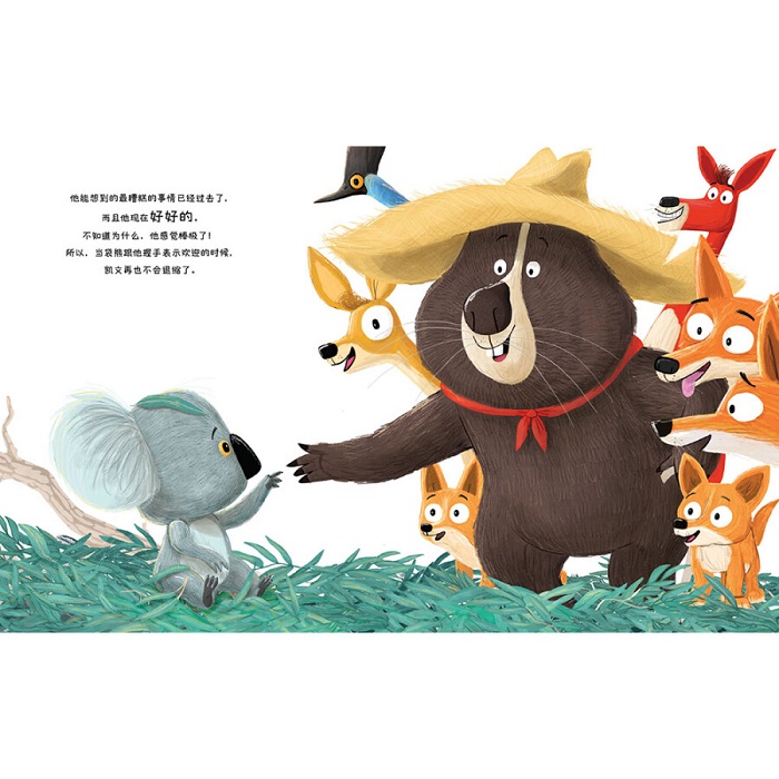 啄木鸟啄断了凯文栖身的大树,大树轰然倒下,凯文 也在一阵惊叫中落到了地上。在落地后,凯文突然发现,原来他担心的一切都没发生,他好极了。他慢慢松开他一直抱着不放的大树,握住了袋熊欢迎的手,他做到了。从此以后,凯文再也不是那个叫着自己做不到的考拉了。他发现,对新事物的尝试,和不断变化的精彩,让……