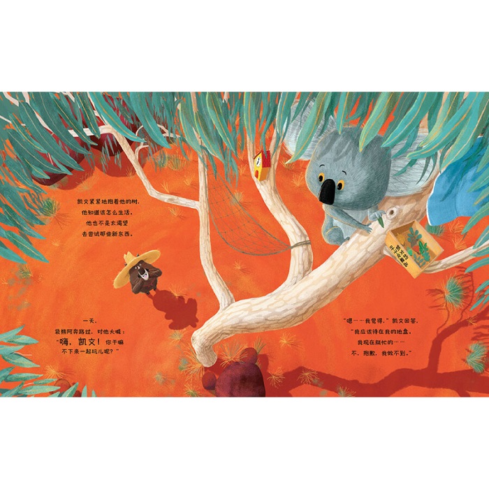 在这个美丽的大峡谷里,生活着一大群野生动物,他们自由地奔跑和玩耍。这里还有一只可爱的考拉,他的名字叫凯文。凯文喜欢挂在树上静静地晒太阳、打盹儿或者吃树叶。是的,在保持静止不动这方面,凯文可是冠军!地面对凯文来说太可怕了,凯文希望静静地待在他的树上直到永远!峡谷里的小动物们经常举办很多有趣的活动,例如野餐啦,篝火晚会啦!他们也对凯文发出了邀请,凯文当然挺想和他们一起玩儿的。 但是习惯了树上生活的凯文可不愿意到地面上来,因为那意味着改变和未知,凯文做不到!但是,一只啄木鸟改变了他……