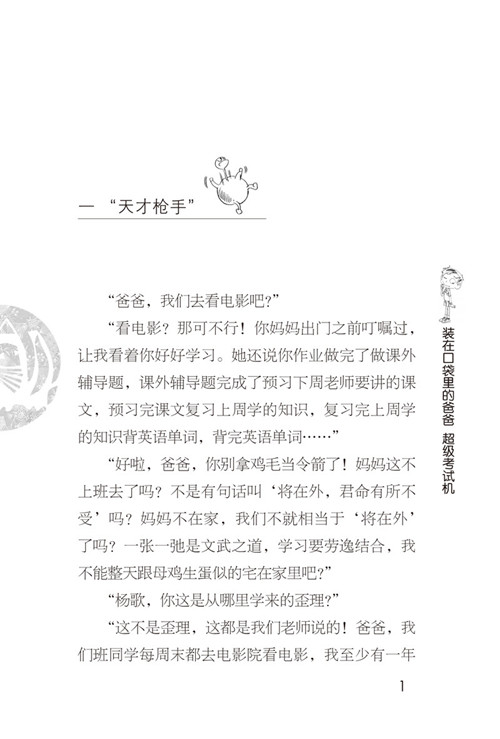 假如你爱自己的爸爸,请把他装进口袋里;假如你恨自己的爸爸,请把他装进口袋里;假如你烦他讨厌他,就找一张报纸把他盖起来,放进抽屉里。《装在口袋里的爸爸》就是这么一本童话书。现在的童话书的内容分为三种:一种是人和动物(或者纯动物的)的关系,一种是人与人的关系,第三种是纯粹的幻想里的各种关系(也可称为幻想小说)。《装在口袋里的爸爸》就是属于第二种童话,它通过童话的夸张手法,非常真切地反映了一个男人或者说爸爸现实的生存状态。有一句广告语说的好:男人也需要关怀。这本童话无疑是体现对男人关怀的主题的,而且是站在一个孩子的立场。