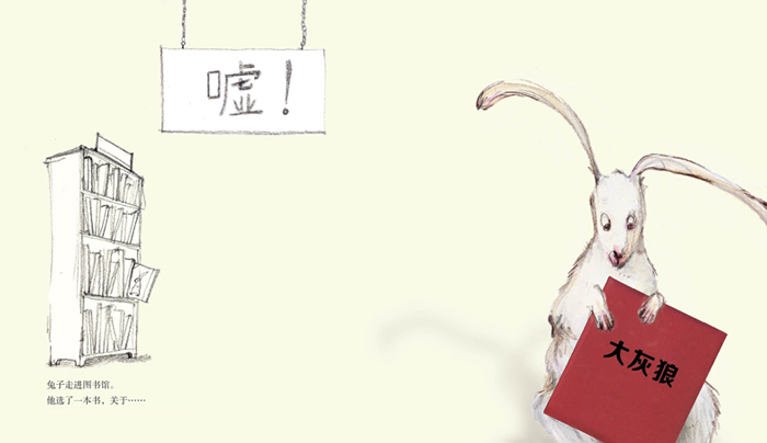兔子从图书馆借了一本书,是关于大灰狼的。他边走边看,看得津津有味:大灰狼群居在一起……几乎能在任何地方生存……尖利的爪子……尾巴……看着看着,兔子觉得似乎哪里有点不对——书中的大灰狼竟然出现在了兔子身后。接下来怎样了?看着破损的书皮,兔子疑似遇难了。但是作者却声明,在书的创作过程中,没有任何兔子被吃掉,她还为那些感情脆弱敏感的读者提供了另一个结局。