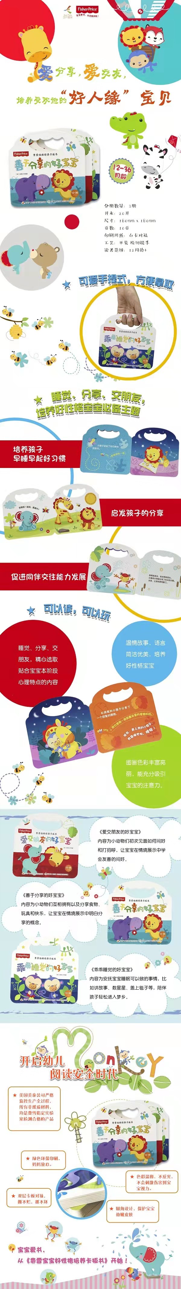 费雪性格培养卡板书系列是中央广播电视大学出版社从美国美泰公司引进的低幼读物。全系列共有3册,分别是《乖乖睡觉的好宝宝》、《善于分享的好宝宝》 、《 爱交朋友的好宝宝》。本系列书采用便于儿童抓取的提手设计,每页选用厚厚的卡板,便于幼儿翻阅。本系列图书画面优美细腻,故事流畅活泼,本书是系列图书中的一本,名为《善于分享的好宝宝》。内容为小动物们互相拥有以及分享食物、玩具和快乐,让宝宝在情境展示中明白分享的概念。