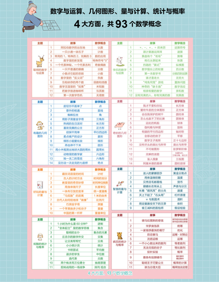 四、“四维法”培养孩子的数学思维。将抽象的数学实物化、图形化、符号化、故事化。参照“教育部小学数学课程标准”编写,涵盖数学4大基础领域,93个概念,从易到难,阶梯学习,唤醒孩子基础的理解和思考能力。
