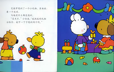 这样的书我们都觉得是给孩子去翻弄去阅读的,可其实它们恰好都是特别值得成年人去阅读去体会的。有孩子的成年人和自己的小白在一起,书可以拿在孩子的手里,也可以拿在大人的手里。大声地读或者轻声地讲都可以。孩子在小白的故事里有自己的愉快自己的感想,成年人有自己的喜欢和触动,不期而至的灵感自然地就成为了明天的智慧和从容,在小白的明天的故事里,后来每一天的故事里,同样还是你去参加,轻松和有趣的程度怎么还会一样?很多年以后,小白的回味和你的记忆,也都是阳光很灿烂,心情很灿烂。