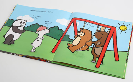 *粗黑色边缘线 明亮舒展的大色块 简洁流畅的图形=超级暖萌画风,让小朋友全情投入故事之中,随着小熊的心情而变化起伏……