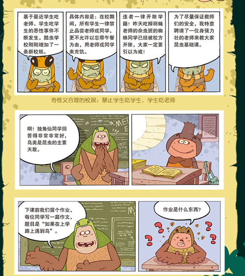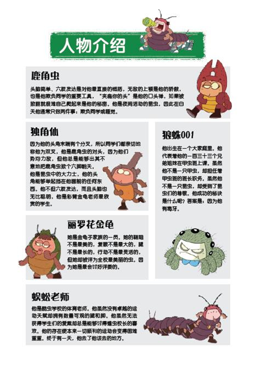 本系列是一套爆笑校园科普类学习漫画。作品以“酷虫学校”为背景,讲述彼此可能是亲属、朋友,甚至是天敌关系的不同昆虫,在校园里发生的各种新奇幽默的故事。书中的虫子师生或调皮机敏、或霸道冲动,或可爱单纯,形象鲜活,充满当下校园的现实感、时尚感。图书集严谨的科学知识和奇特的文学想象于一体,科普知识严谨准确,又与故事情节紧密关联,是一套有关昆虫的趣味“小百科全书”。孩子在捧腹大笑的同时,不仅能掌握昆虫的科普知识,还能体悟自然法则。本套系填补了国内有关昆虫知识漫画的空白,是原创科普漫画一次有益的尝试。法语版与中文版图书同步出版。《无敌新同学土鳖》:飞虫班里来了一位新同学土鳖,土中生活的他总是固执地在同学们脚下穿梭,直到教室成为一片废墟。可是浑身土腥味的土鳖同学却和甲虫班的屎壳郎同学成了好朋友,这是为什么呢