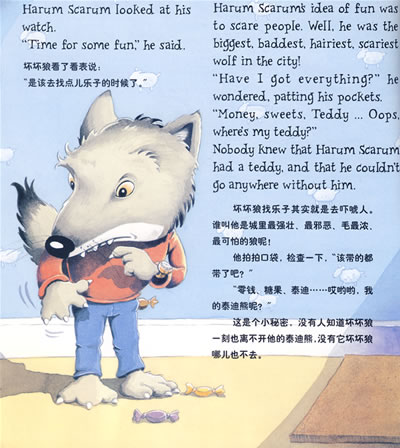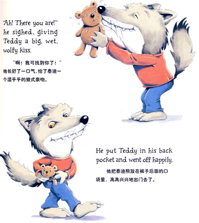 画面生动可爱,虽然坏坏狼很坏,老是去吓唬别人,但是他的内心里也有温柔脆弱的一面,他是那么的依赖他的泰迪.其实哪个人又不是这样呢?我们每个人都有最依赖的一个人或是一件东西.这本书不只孩子喜欢看,大人也喜欢读.我给孩子在当当上买了百余本图书,最喜欢的就是绘本类,不是重洋媚外,而这这些国外的故事书确实好看,有些温暖,有些感动,有些快乐,有些深思,每本书都能带给孩子和大人很多的快乐.当当网送书的小伙子已经很熟了,每次都说如果将来我孩子不上清华北大就对不起我的这些书.其实不然,我给儿子买这些书并非是让他学习什么知识,更多的是想让他多一些开心,其实在看这些书的同时,也陶冶了他的情操。