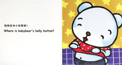 1.把宝宝抱在腿上,翻开一页,提出问题,如“抱抱熊的小脚丫在哪呢?”并掀开盖板,假装非常惊奇地发现了小脚丫。