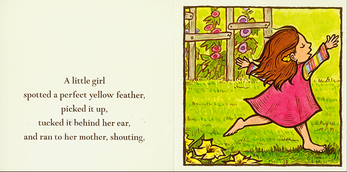 在院子里,小女孩捡到了一根漂亮的羽毛,而且急着回家向妈妈报告,因为今天是好日子哦!
