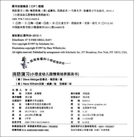 《小恐龙幼儿园情商培养图画书:消防演习》由史蒂夫·梅茨格著。你认识小恐龙幼儿园的小朋友吗?爱干净,也爱泥巴;爱宝贝玩具,也爱大家分享;会调皮捣蛋,也会真诚道歉;会蛮横霸道,也会团结友好;会生气闹别扭,也会开心拉拉手;会迁就小伙伴,也懂得“我说了算”;会羡慕跑步冠军,也热爱故事大王!有时候,他们是世界上最最最想发脾气的小恐龙,可是只要一秒钟,他们就能找回开心和轻松……这就是可爱小恐龙,他们在幼儿园里非常快乐!他们相亲相爱,爱爸爸妈妈,爱老师、小伙伴,爱雨天,爱滑雪,爱郊游,爱虫虫,爱摘苹果,爱扮超人,爱拍集体照,最爱唱歌、跳舞,爱大家一起玩!快来加入可爱小恐龙的队伍,看看幼儿园的生活是多么有趣吧!