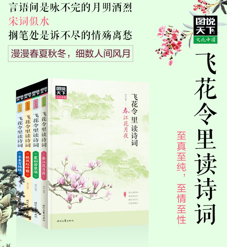 飞花令源自古人的诗词之趣,诗词之美,美在情感之真纯,亦美在表达之深刻。无论时代如何更迭,流传千古的经典诗词依然是中国传统文化中最为灿烂的一抹亮色,以其真实的表达与动人的遐思,在历史的长河中缤纷闪耀,熠熠生辉,影响着一代又一代的中国人。故此,我们策划编辑了《图说天下·文化中国:飞花令里读诗词》这套丛书。