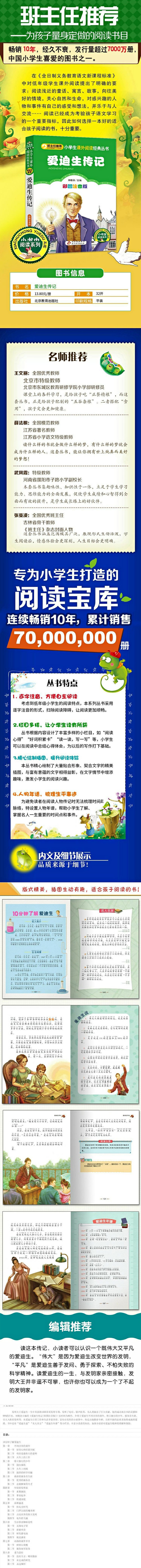 《爱迪生传记》托马斯?阿尔瓦?爱迪生,美国著名的发明家、企业家,是世界上第一个利用大量生产原则和工业研究实验室来生产发明物的发明家。他在美国、英国、法国和德国等地的专利数累计超过1500项,拥有2000余项发明,其中包括对后人影响极大的留声机和白炽灯泡等。这本专门写给孩子的书用简洁的语言勾勒了爱迪生富有传奇色彩的一生,讲述了他的成长经历、他对理想的追求和他的卓越成就。孩子们可以在阅读中了解丰富的知识,还能感受到爱迪生一生对科学满怀热情的探索精神。