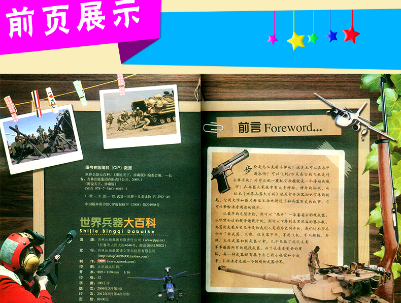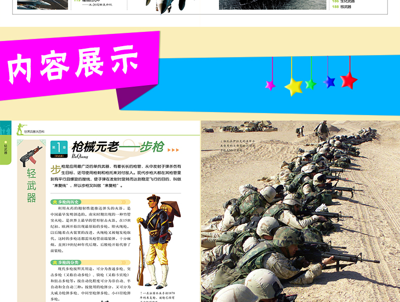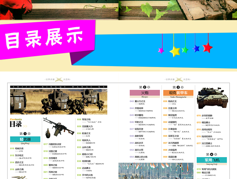 《世界兵器大百科》共分为了轻武器、火炮、坦克装甲车、军用飞机、军用舰艇、导弹、生化武器和核 武器七章,几乎包括了现代主要军事强国所有的现役武器。为了让读者更好的理解,每一种武器都有属于自己的小秘密和小故事,引领读者走进一个阳刚的武器世 界。传奇的枪炮,铁甲的坦克;翱翔的战机,威猛的军舰;100多种神秘的武器,600多幅精美的图片;近距离地体会,真实的武器世界。