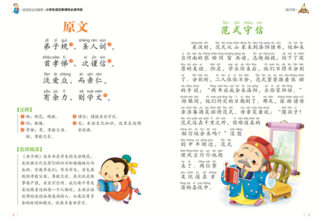 《弟子规》是一本传播广泛、影响深远的蒙学读物。《论语-学而》中有一段话:“弟子入则孝,出则弟,谨而信,泛爱众,而亲仁。行有余力,则以学文。”这段话的意思是说:弟子们在家要孝敬父母,离家外出要尊重兄长,做事要谨慎而坚持诚信,对大众要有博爱情怀,亲近那些有仁德的人;如果做事有余力,就去学习古代文献,增长知识。《弟子规》正是具体阐述了这段话的含义,先后有序地讲解了学童们孝敬父母、关爱兄弟、尊敬长辈、修身养性、为人处世、读书求学的基本生活规范