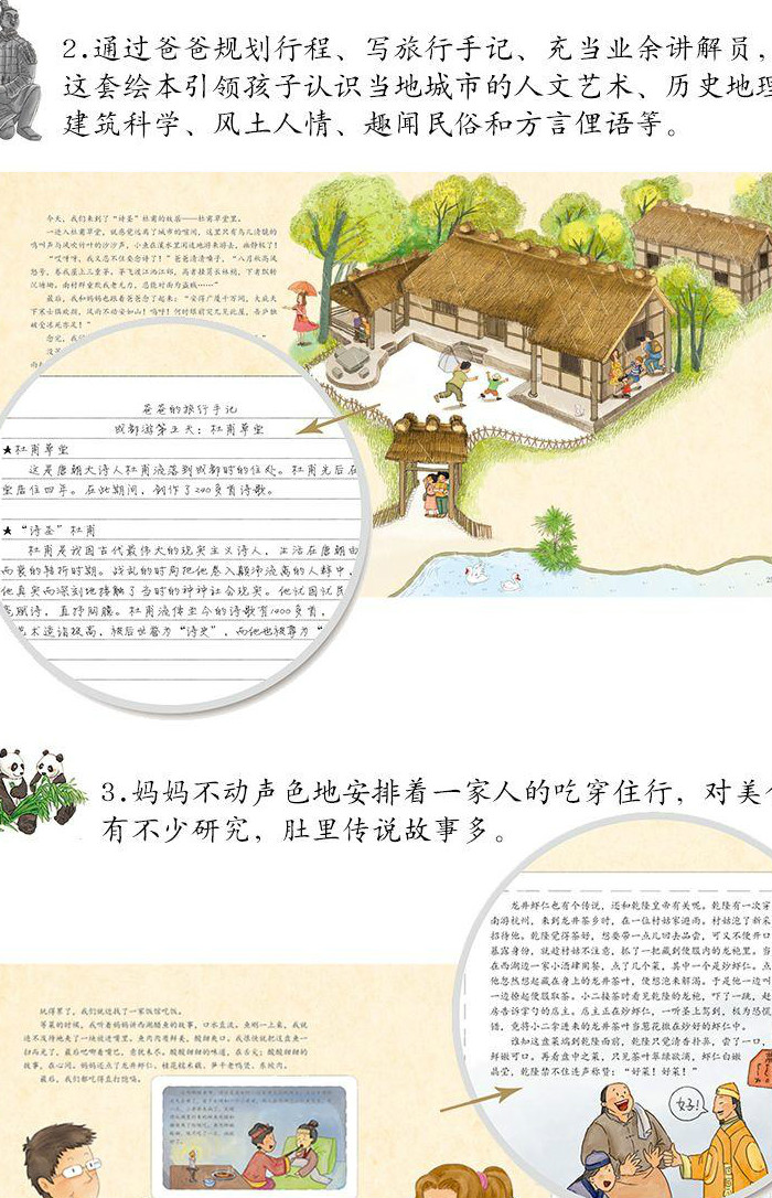 通过爸爸规划行程、写旅行手记、充当业余讲解员,妈妈不动声色的安排衣食住行,引导孩子认识当地城市的人文艺术、历史地理、建筑科学、风土人情、趣闻民俗和方言俚语等,让孩子们在玩中学、学中长。