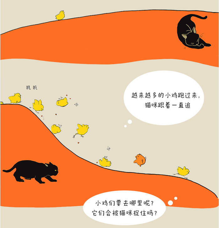 “叽叽叽”,一只小鸡跑了过来,睡懒觉的猫咪醒了,刚想追,又一只小鸡边叫边跑过来。 “叽叽叽……”越来越多的小鸡跑过来,猫咪跟着一直追…… 小鸡们要去哪里呢?它们会被猫咪捉住吗? 一个只用“叽”字讲完的故事,既紧张又开心,让宝宝咯咯笑不停,在爱的怀抱里自然获得语言启蒙!