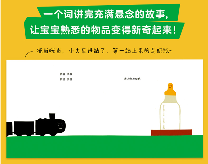 咣当咣当,小火车进站了,弟一站上来的是奶瓶。咣当咣当,小火车又进站了,弟二站上来的是杯子和小勺。咣当咣当,小火车继续出发。下一站谁会上车?小火车要开到哪里去? 一个词讲完充满悬念的故事,让宝宝熟悉的日常变得新奇起来,在慢悠悠的节奏中获得语言启蒙,开启美好的一天!