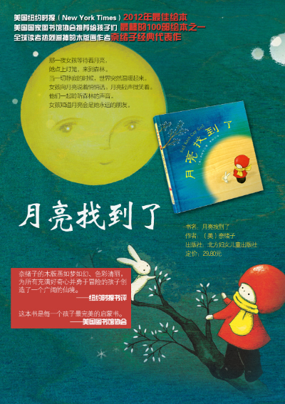 关于《月亮找到了》,她说:“在夜深人静的时候,关掉所有的灯,在喧嚣和霓虹之上,倾听大自然的静籁。不管我们居于何地,在寂静的夜,都能欣赏到星星月亮无与伦比的迷人光辉,就像戴红帽子的女孩和她的朋友们。”