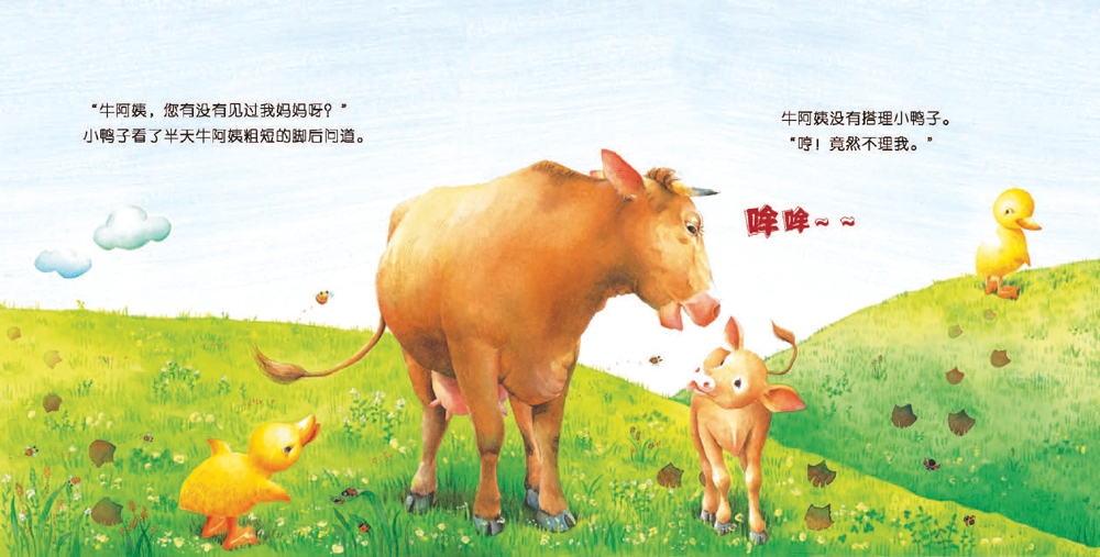 牛阿姨,您有没有见过我妈妈呀?”小鸭子看了半天牛阿姨粗短的脚后问道。牛阿姨没有搭理小鸭子。“哼!竟然不搭理我。”“猪大婶!您有4个脚趾啊!可是,后面的两个脚趾为什么这么小呢?”小鸭子不解地问道。猪大婶也没有回答小鸭子,依然低头欢快地吃着槽里的食物。“鸡大婶!您知道我妈妈在哪里吗?”……