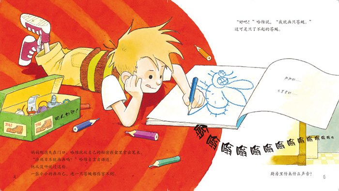 《涂鸦日》:妈妈说:“没人会在涂鸦日画画!”这是为什么?哈维偏不信,等妈妈出门后,他拿出画笔,画了苍蝇,画了蜘蛛,又画了一只大鸟……于是,麻烦来了。