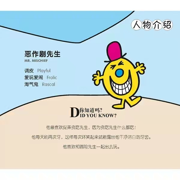 恶作剧先生喜欢调皮捣蛋。当他为糊涂小姐刷房子的时候,他把整个房子刷成了五颜六色。但是他的恶作剧没有起作用,糊涂小姐反而觉得他是个天才。简洁、幽默的文字内容,让孩子们在欢笑声中学会表达自己的情绪,正确认识自己;故事情节充满乐趣,诠释着生活中待人接物的基本道理和原则。