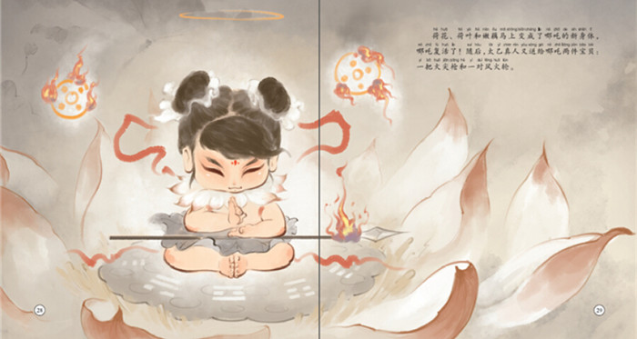本丛书选取中华经典故事,以中国水墨画等插画的表现形式呈现,可以让家长和孩子一起重温经典,领略中国传统文化。《哪吒闹海》取自于明代神魔小说《封神演义》,讲述了哪吒失手杀掉作恶的龙王三太子后,不忍牵连陈塘关百姓而自刎,之后师父太乙真人借助莲花复活了他,他踩着风火轮去报仇的故事。其主角人物哪吒天真烂漫、不畏强权,备受人们喜爱。本书采用装饰版画与水墨画结合的插画表现形式,古朴优雅,有浓浓的中华艺术美。另外,书中标有拼音,小朋友自己也能无障碍阅读。