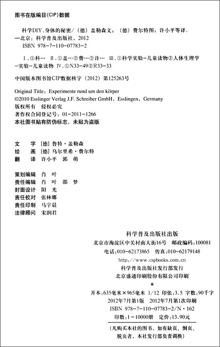 把科技馆带回家·科学DIY:身体的秘密》内容简介:你曾经头朝下喝过水吗?你测量过指甲的长度吗?鸡皮疙瘩是怎样产生的?在这本有趣的关于“身体”的实验书里,给你讲解了,怎样用很简单的材料来探索和揭示这一切。很多实验材料你家中就有——马上开始工作吧!