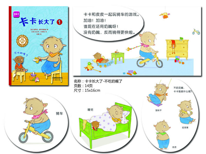 在《卡卡长大了:不吃奶嘴了》中,卡卡和他的小伙伴皮皮,一个吃安慰奶嘴,一个还吃手指。书中的故事里,吃手指的皮皮和吃奶嘴的卡卡遇到了好多麻烦。*后,他俩终于尝试着,不吃奶嘴和手指了。