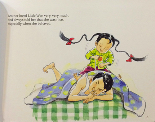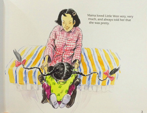 When Little Wen hears that hair bangs are in fashion, she cuts her own hair. It looks terrible! But Mama still thinks she is pretty. When Little Wen writes “4” upside down, all her friends laugh at her. But Baba says she is being creative. When Little Wen sucks the air out of a glass, leaving a big, bruised circle on her face, Baba shows her how she can start a new fashion.