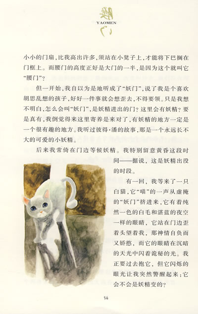 它是从腰门挤进来的。那时,我以为它是妖精变的。“喵——”白猫冲着我叫了一声,声音软绵绵的,听得我心里也软绵绵的。