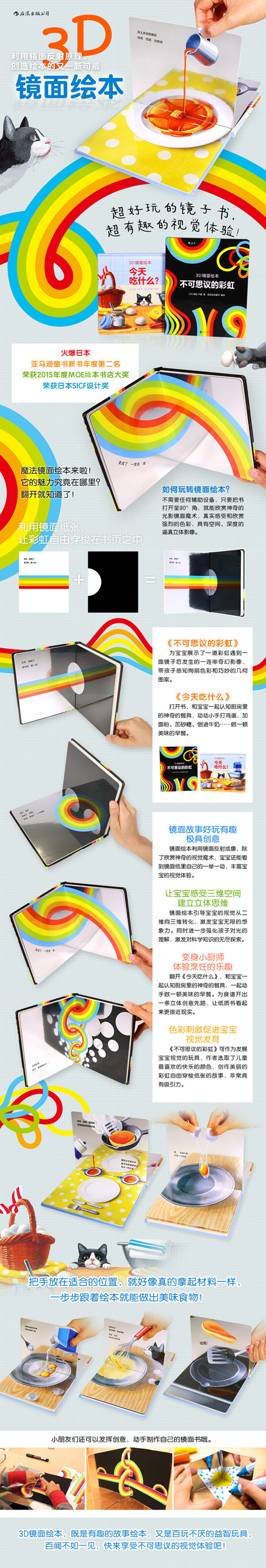 镜面绘本《不可思议的彩虹》利用镜面纸反射,让绘本形成了三维空间,给我们独特的立体体验和视觉感受:彩虹自由穿梭在书页之中,像变魔术般穿过了纸张。
