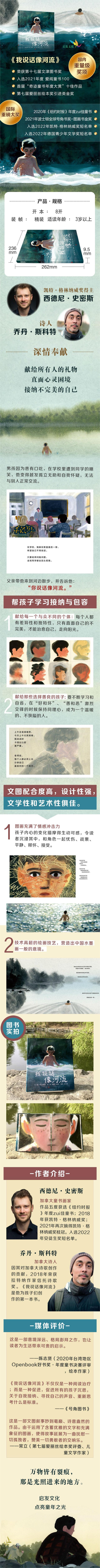 一个男孩因为患有口吃,在学校里遭到同学的嘲笑,他变得越发孤立无助和自我怀疑,无法与别人正常交流。父亲带他来到河边散步,并告诉他:他说话像河流。他开始以一种全新方式思考他的口吃,意识到他说话的方式有时是波涛汹涌,有时是风平浪静,就像河水的变化。故事超越了在自然世界中找到平静的安慰,做出了更为深刻的比较和联系。折叠大拉页更像一扇门,令人印象深刻,打开后呈现的是男孩拥抱着波光粼粼的河水,他最终接纳了自己的全部。 诗人乔丹.斯科特根据自身的经历,以真实动人的书写方式,描绘了一个口吃男孩的心路历程,搭配凯特.格林纳威奖得主西德尼.史密斯无与伦比的图画,共同成就了这个充满诗意且充满力量的作品。这本书特别要献给那些迷失、孤独或与群体格格不入的人。这也是一个献给所有人的礼物,疗愈心灵深处的痛苦与孤独。