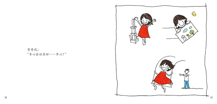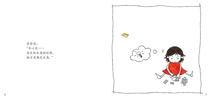 《Grace说专心》是启发文化出版的启发精选华语原创绘本系列之一,适合3岁以上儿童阅读。 Grace曾经是个注意力不集中的孩子,比如爬楼梯不看路,爸爸提醒她要专心。她问爸爸什么是专心,爸爸的回答很简单:专心就是“你在玩乐高时,满脑子都是乐高” …… Grace一下子就听明白了。Grace的爸爸不但在家中随时提醒她要专心,还在外出的时候带她去看各行各业的人怎么专心。Grace还把“专心”带到学校,她告诉同学专心“就是眼睛要看前面,不要看旁边”。 你有专心的特质吗?怎样才能做到专心?《Grace说专心》就是让小孩来教小孩的简单书,文字简洁、色彩简单,潜移默化间进行抽象而重要的性格培养。