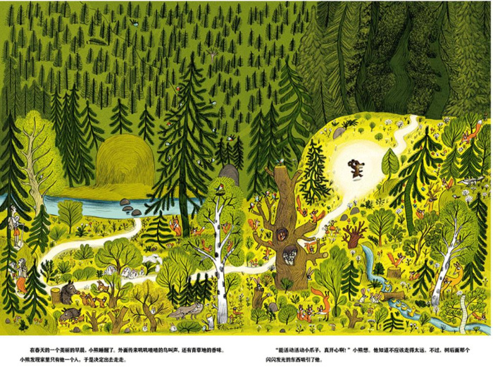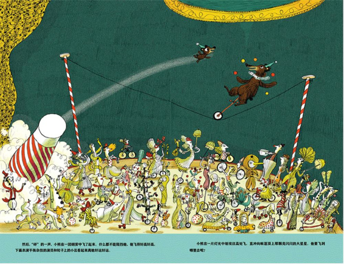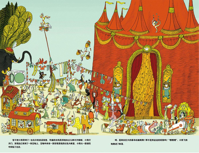 清晨,当小熊一觉醒来,发现熊爸爸和熊妈妈都不在家,他们去哪儿了呢?不如来找找看吧!就这样,小熊一路经过了森林、地下管道,来到了马戏团。马戏还真热闹啊,有跳火圈、空中飞人、舞狮、独轮车走钢丝、顶盘子。*后亮相的是小熊一家,连妹妹都登场了。表演完毕,观众们报以热烈的掌声,小熊一家也高兴地回家去了。不过,这真的是故事的结尾吗?