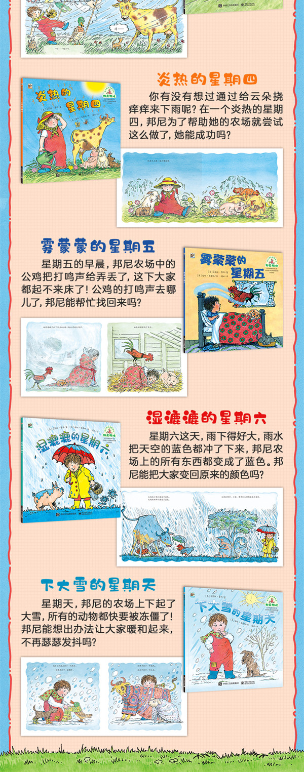 开花的猫咪柳叫个不停,鸭子竟然发出了“哞哞”声,公鸡弄丢了打鸣声,农场里的动物们一会被冻得瑟瑟发抖,一会被热得烦躁不安,一会又被一场大雨浇成了蓝色……从星期一到星期天,农场里每天都有新鲜事,这可忙坏了邦尼。看看聪明的邦尼是怎么解决这些问题的吧!