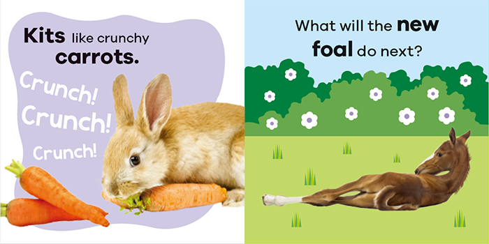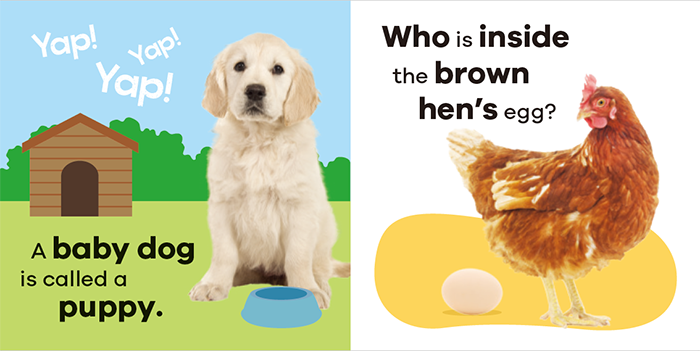 这本有趣的绘本中藏着各种动物幼崽,有小狗,小鸡,小马驹,小羊们,小兔子,小猪,小猫,小牛,小长颈鹿,看看小朋友们能认识记住多少个小动物的名字?