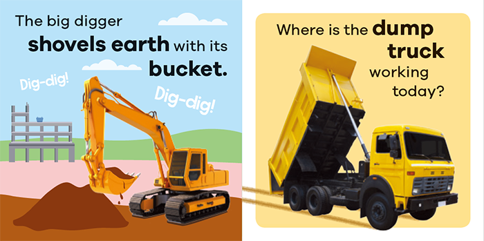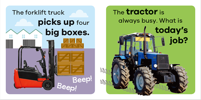 这本有趣的绘本中介绍了哪些繁忙的机器在工作?挖掘机桶铲土,自卸卡车工地工作,压路机畅通道路,推土机推碎石,汽车起重机吊砖块,叉车捡大箱子,拖拉机播种子,联合收割机收割庄稼,扫雪机清废,混泥搅拌机搅拌凝土,卡车运输货物,看看小朋友们能认识记住多少机器的名字?