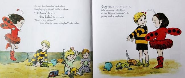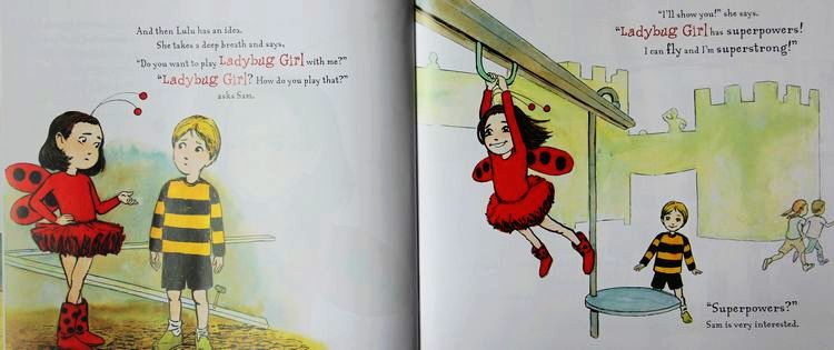 At the playground, Lulu asks her friend Sam if he wants to play with her. Sam likes Diggers, while Lulu thinks Monkeys is the best game. Sam suggests playing under the castle, but Lulu knows that the top is the most fun. They just can’t agree! And then Lulu asks, “Have you ever played Ladybug Girl?”