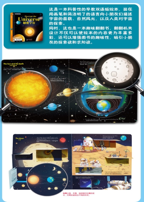 这是一本中英文双语科普读物,由创意绘画场景图与各种创意翻翻、拉一拉、滑一滑、窗口等多种互动形式,让宝宝们可以看到广阔的宇宙,了解宇宙的来历及形成,了解太阳系及周边星球等等。这是一本中英文双语科普读物,由创意绘画场景图与各种创意翻翻、拉一拉、滑一滑、窗口等多种互动形式,让宝宝们可以看到广阔的宇宙,了解宇宙的来历及形成,了解太阳系及周边星球等等。